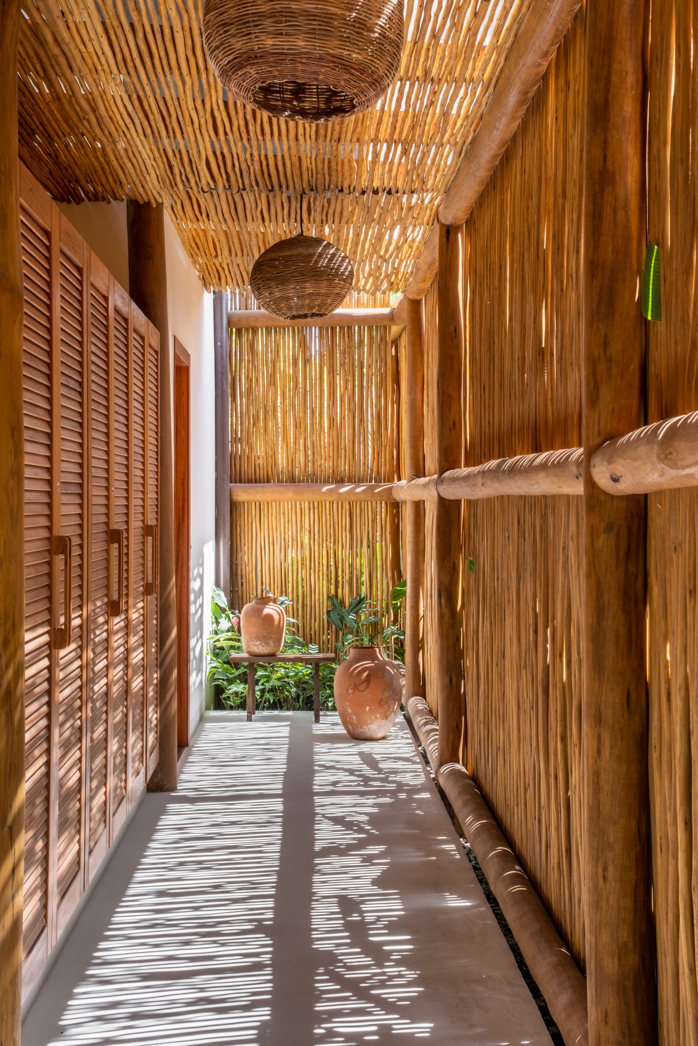 Estrutura em eucalipto, fechamentos em biriba com cobertura em vidro, criando uma grande varanda/pergolado no centro do lote criando a grande galeria de distribuição da casa, ligando a área social, serviços a área intima. O lugar de estar. Uma arvore existente no lote foi mantida estrategicamente e integrada a varanda criando ao mesmo tempo uma memoria do lugar e um anteparo privativo e natural. Este percurso feito ao entrar na casa, pela varanda chegando à piscina é repleto de sensações e visuais de qualidade.