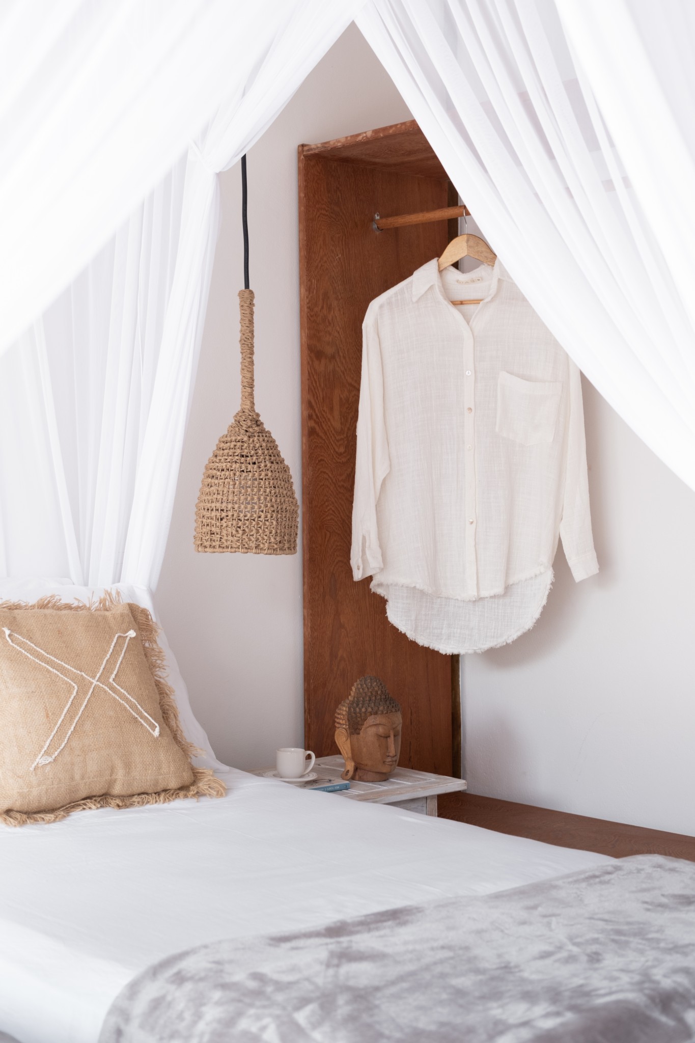 A área intima, voltada para o leste, recebe o sol da manha e fica completamente reservada em relação a grande varanda e a área social por uma circulação fechada por vidro e biribas criando uma dança entre a luz e a sombra durante o dia pois aproveita a luz do sol. Todos os dormitórios são abertos para um jardim tropical reservado.