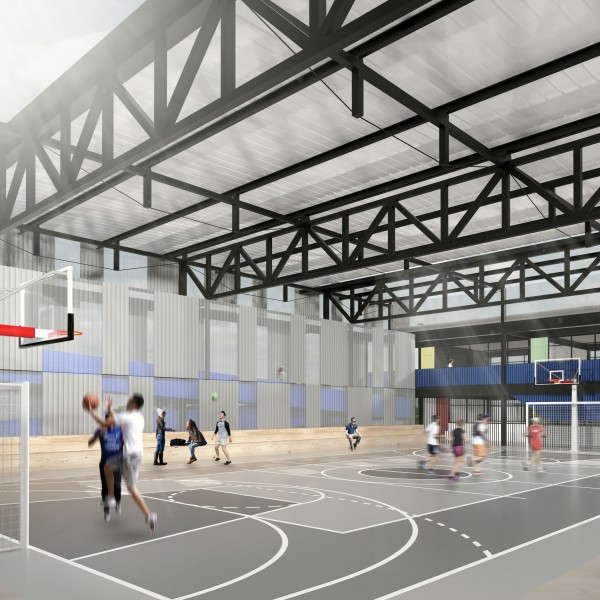A estrutura metálica modular se mostrou mais adequada para atender aos anseios do edital quanto a facilidade e agilidade construtiva, além de ser leve e propiciar aumento do espaço útil e vãos livres maiores. Optamos por utilizar pilares e vigas modulares tipo perfil “I” parafusados projetados para fabricação industrial e seriada, de preferência, levando a um menor tempo de fabricação e montagem, na cobertura da quadra (pátio coberto) por conta do grande vão utilizamos uma estrutura mista de treliça metálica plana x viga vagão de aço cobertas por telhas metálicas (modelo trapezoidal) termo acústicas e telhas de policarbonato, para a passagem de luz natural.