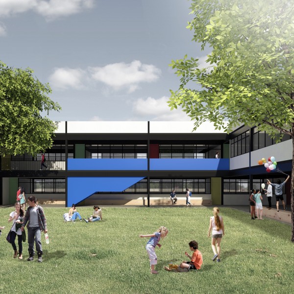 As esquadrias serão modulares de alumínio com vidros temperados incolores, todas as salas de aula terão aberturas em fachadas opostas, permitindo a ventilação cruzada e a renovação adequada do ar interno. As folhas das portas deverão ser executadas em madeira compensada, semi-ôca, revestidas com laminado melamínico de 1mm colorido, mesma cor dos pisos de granilite das salas, criando uma identidade visual.