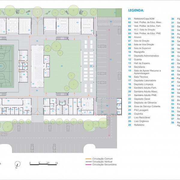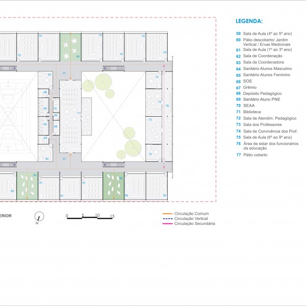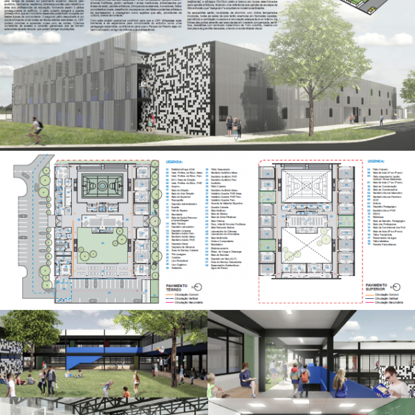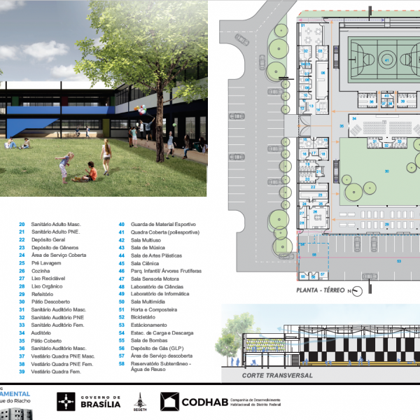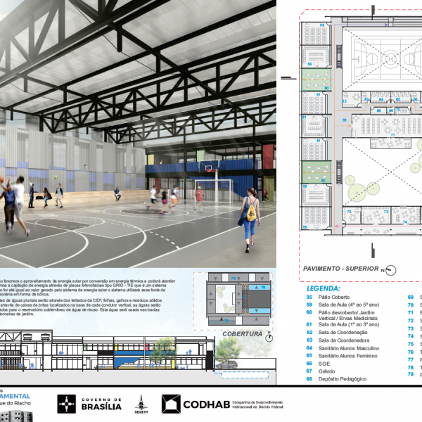 O programa de necessidades é organizado em duas lâminas de 2 pavimentos conectadas em pontos estratégicos, primeiramente pela rampa de acesso ao pavimento superior, depois pelo auditório, banheiros, vestiários, biblioteca e então pelo refeitório e área dos profissionais da educação, formando assim 2 pátios (protagonistas do edifício). O pátio coberto abrigará a quadra poliesportiva que em momento especiais poderá ser ocupada por festas típicas da comunidade. O segundo pátio descoberto é um cuore-brincante onde todas as faixas etárias atendidas no CEF podem conviver e aprender umas com as outras. Criamos corredores de acesso e conexão generosos que se tornam extensões da sala de aula, que podem abrigar exposições, com vista para os pátios, uma trilha lúdica que alinhará todos os espaços do CEF, oportunizando que as crianças, adolescentes e adultos que ali irão conviver diariamente sintam-se não só acolhidos, protegidos, mas também desafiados a conquistar cada cantinho do Centro. Na distribuição das salas do pavimento superior optou-se pela criação de bolsões verdes, pátios descobertos (respiros), mirantes para observar o que se passa lá fora. Pois a verdadeira escola é a aldeia, é o bairro, o bairro-escola, nossa casa comum. Até os educadores, funcionários e familiares terão seus espaços de encontro e de descanso.