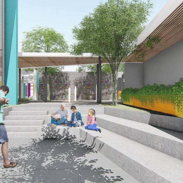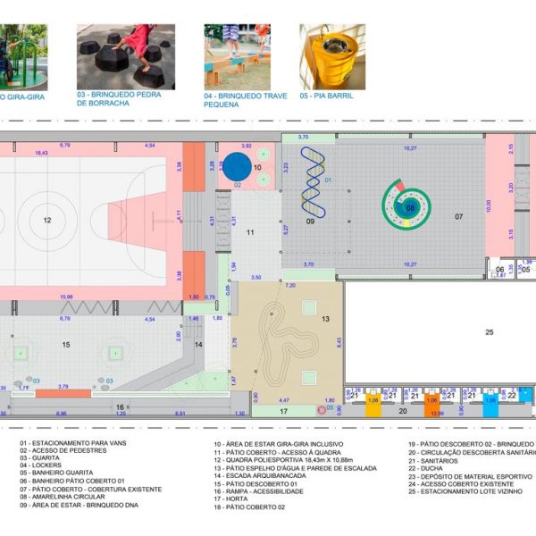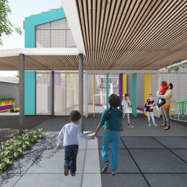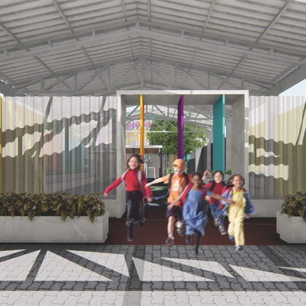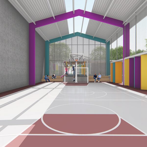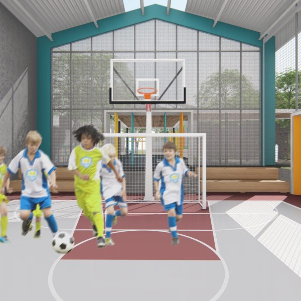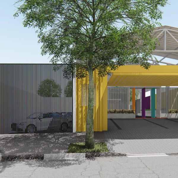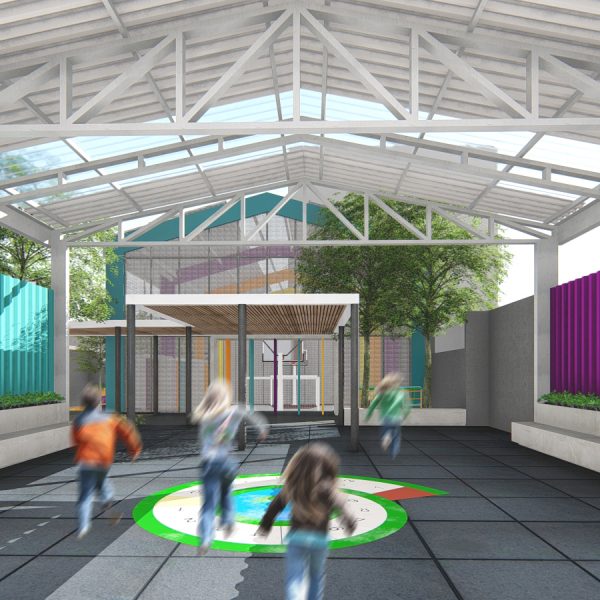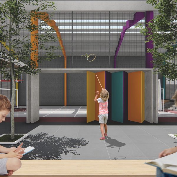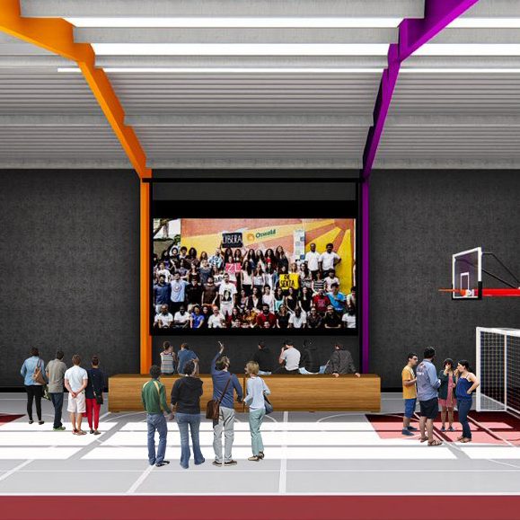 Projeto de arquitetura para um pátio aberto com quadra poliesportiva, áreas recreativas e de estar, além de retrofit de cobertura metálica para a nova Unidade Harmonia do Colégio Oswald no bairro da Vila Madalena em São Paulo – SP.