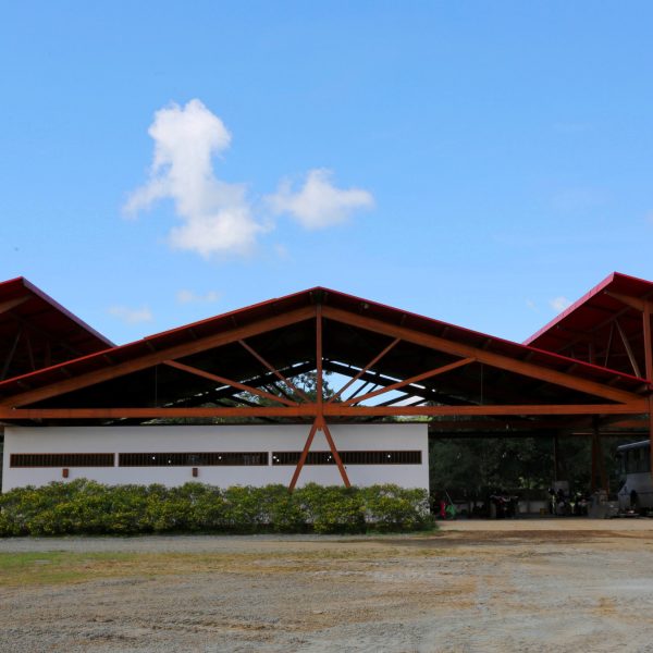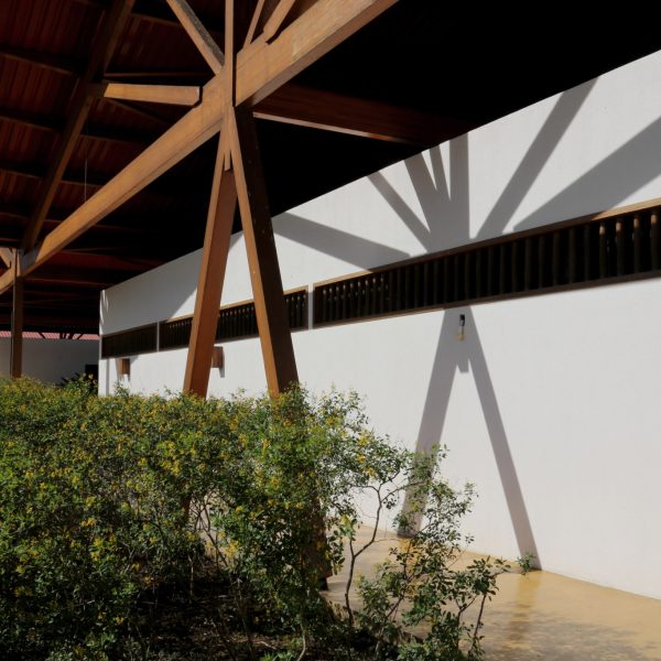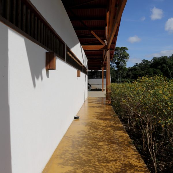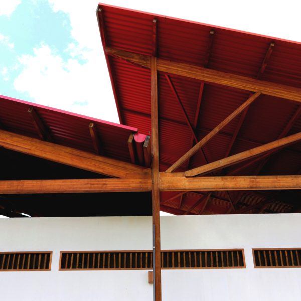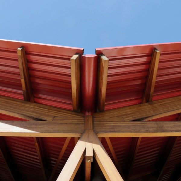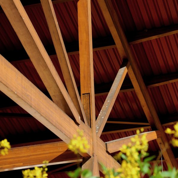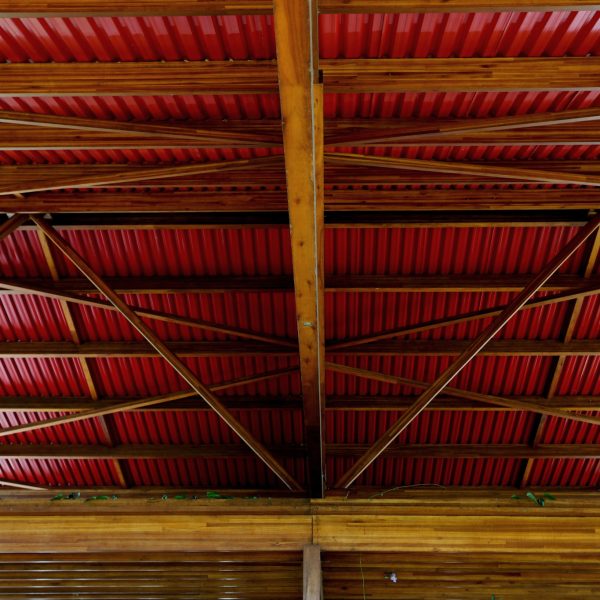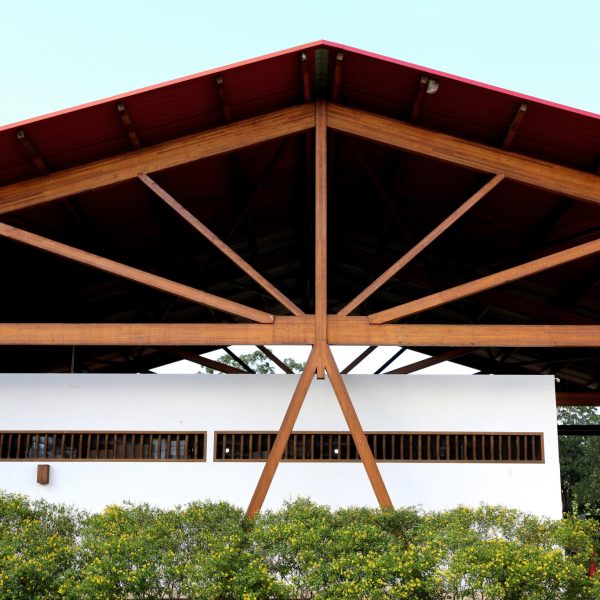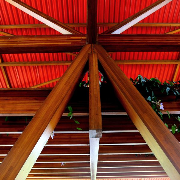 O sistema construtivo adotado foi: Estrutura independente de MLC – Madeira Laminada Colada (sendo pilares associados às vigas de MLC, sobre base | fundação de concreto) cobertas por telhas metálicas termoacústicas (modelo trapezoidal pintada).