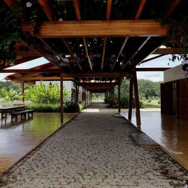 Também foram utilizados planos de cobogós e intertravados de solocimento estimulando a produção local.