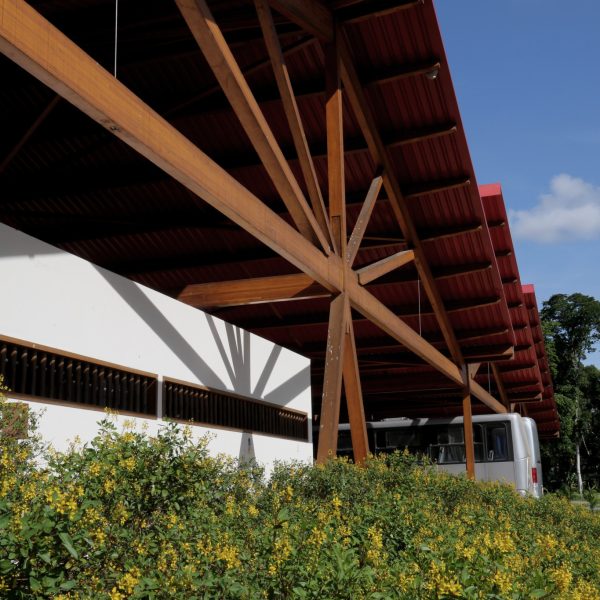 A escolha da Madeira Laminada Colada (MLC) de Eucalipto se deu em função de ser um material renovável que permitia a pré-fabricação de peças de grandes dimensões atendendo a necessidade da proposta de agilidade na construção.