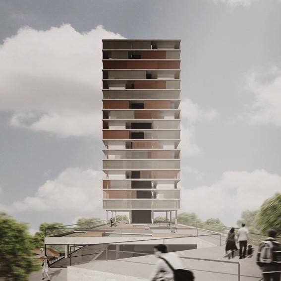 O projeto foi implantado tentando acompanhar a topografia original para evitar grandes movimentos de terra. A laje que está no nível da rua principal, onde acontece a entrada do edifício, se forma uma grande praça. Nesta área se encontra um volume com fechamento em vidro, onde acontece a distribuição da parte baixa e alta do complexo. A parte alta do edifício está acima do nível da rua, este volume de 38x29x63 metros possui uma pele criada a partir de elementos vazados de diferentes desenhos, locados ora sim, ora não, trazendo leveza e principalmente a transparência do exterior para o interior. O sombreado do elemento vazado cria um desenho na parede dos dormitórios, além de manter dessa forma uma boa ventilação e iluminação natural para os espaços de moradia.