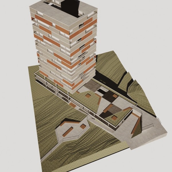 Considerando manter as curvas de níveis existentes, sem grandes alterações, a ideia inicial para o projeto de habitação estudantil para a UNIFESP surgiu a partir da topografia da área de intervenção. Norteado pelo terreno, a proposta consiste em um primeiro volume que se adapta às curvas naturais, e um segundo volume superior de gabarito alto, criando um ponto de referência para o bairro. O projeto terá uma única entrada que acessará todo o edifício, que será realizada pela rua principal, a parte alta do terreno. A partir desta entrada acontece a setorização dos usos. No bloco superior estão locadas as moradias estudantis e no bloco inferior toda a área técnica e os espaços de uso comum. Já o acesso pelo parque, a parte baixa do terreno, será feita livremente.