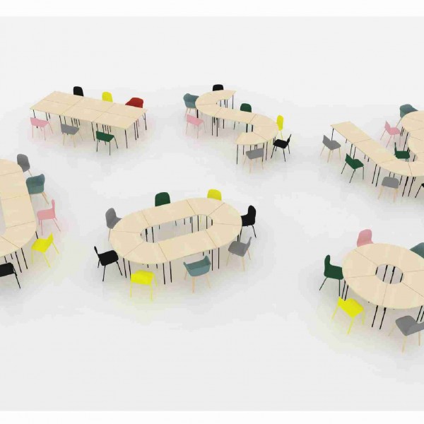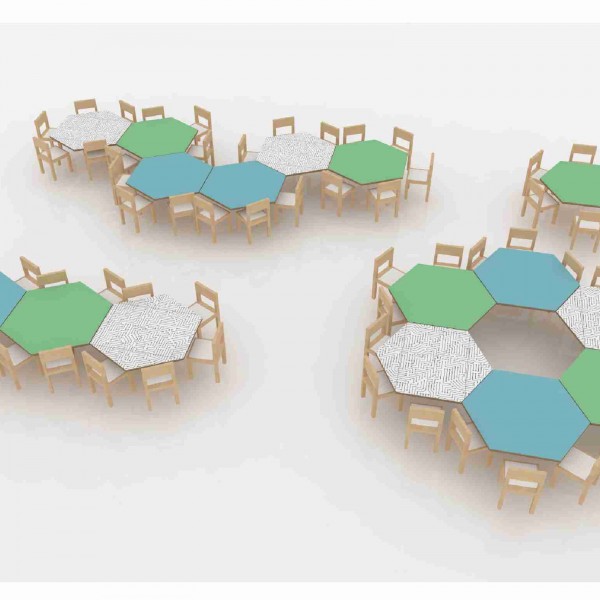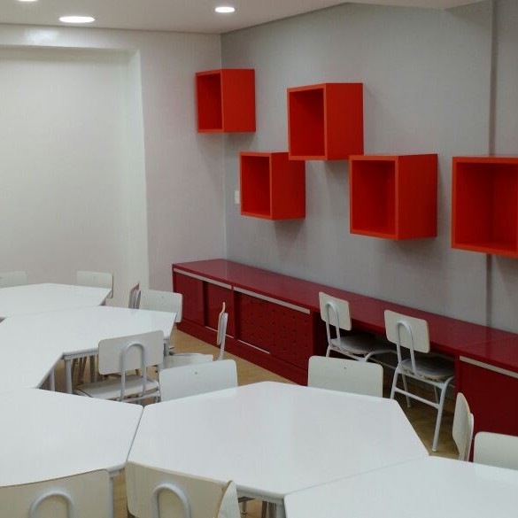 O mobiliário é disposto em toda a sua extremidade por mesas fixas, armários / lousas que servem como uma espécie de “recurseria”, um recinto onde pode ser armazenado sucatas, madeiras, recicláveis e diversos outros materiais de uso de alunos e professores durante os processos de criação. Estes armários também foram projetados para guardar e carregar os dispositivos eletrônicos, tais como notebooks, impressoras, scanners, etc. Por apresentar um centro livre e tomadas penduradas, o mobiliário móvel facilita a mutação e agrupamento dos usuários caso haja necessidade, resguardados a menor probabilidade de falta de energia.
