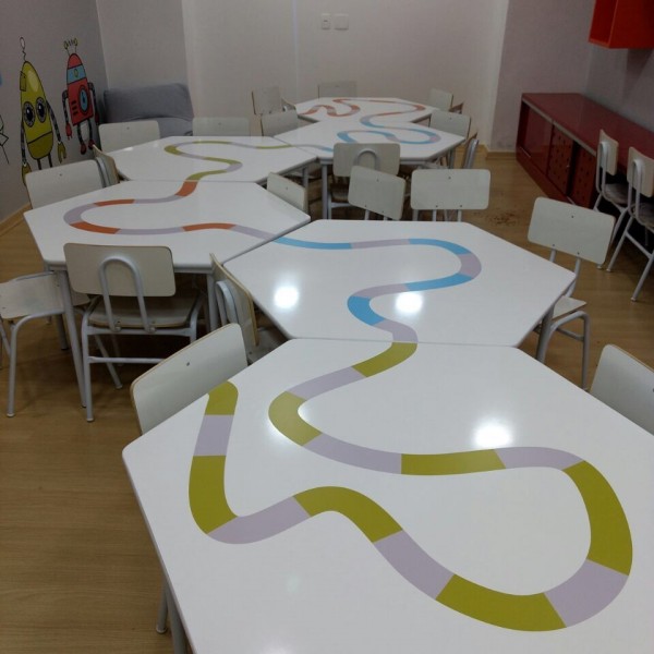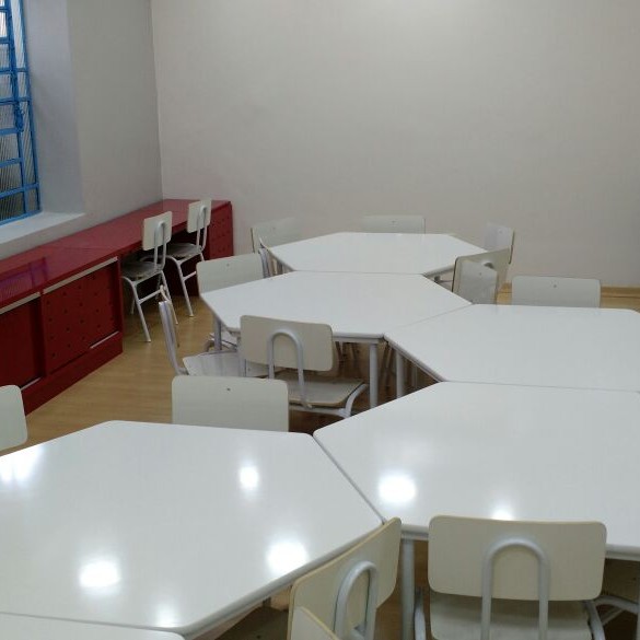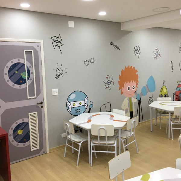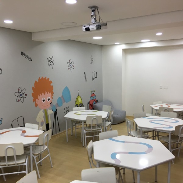 Outro aspecto que merece destaque está facilmente perceptível nas paredes que receberam uma pintura especial na qual proporciona a essas superfícies a possibilidade de serem grandes lousas.