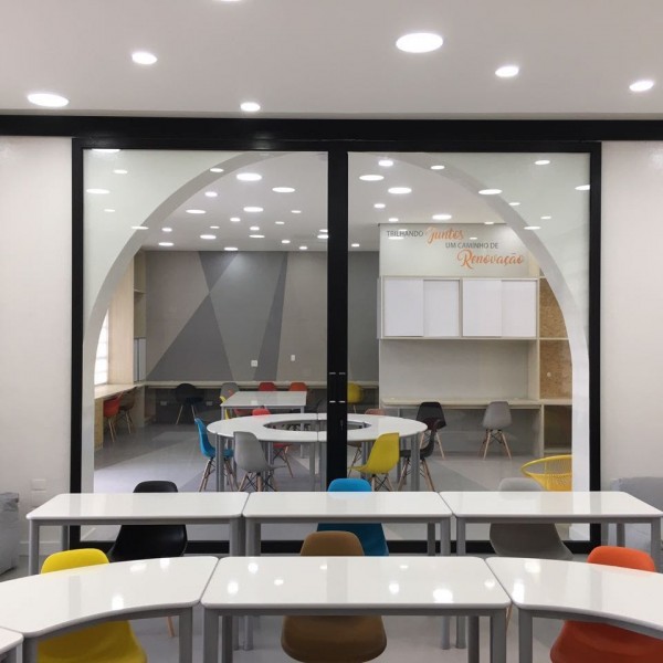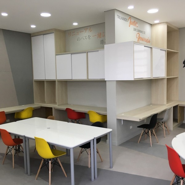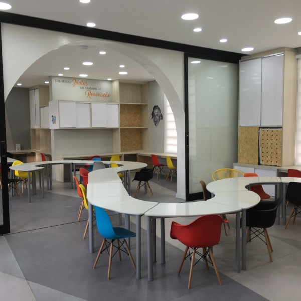 No que diz respeito às cadeiras, as mesmas ajudam a criar um ambiente descolado, contemporâneo e jovem, o que contrapõe com as cores neutras das paredes, pisos e demais mobílias. Já os armários e mesas compostos por cores claras, formica tipo lousa e revestimento em OSB (material derivado da madeira constituído por pequenas lascas orientadas em camadas cruzadas) remete ao espaço a ideia do reuso e de sustentabilidade.